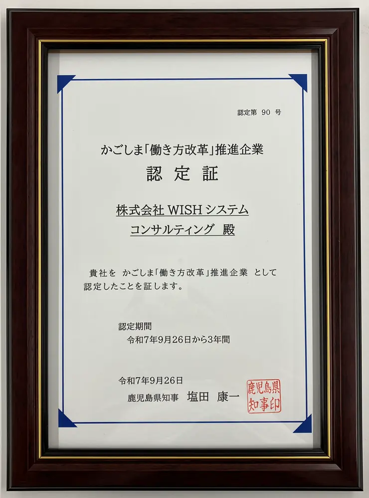 かごしま「働き方改革」推進企業 に認定されました 2025-09-29 最終更新日時 : 2025-09-30 WISHシステムコンサルティング管理 2025年9月26日、鹿児島県からかごしま「働き方改革」推進企業に認定されましたので、お知らせします。認定証交付式の模様です。 当社の取組について https://www.pref.kagoshima.jp/af04/sangyo-rodo/rodo/hatarakikata/documents/66011_20250917154917-1.pdf ↑外部サイトが開きます